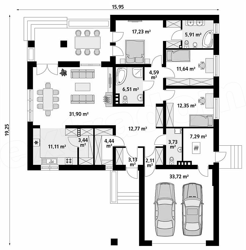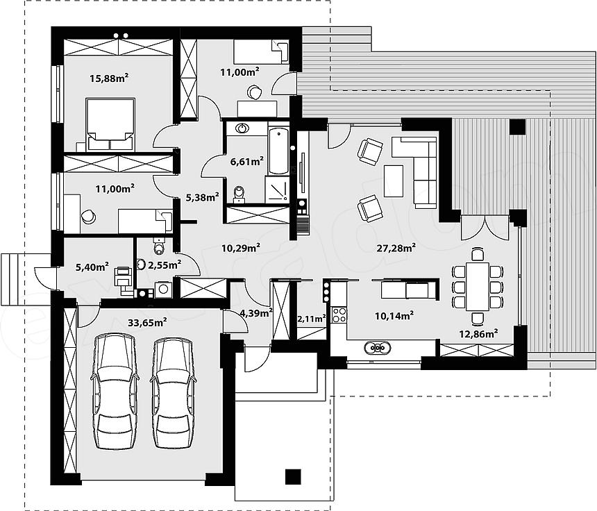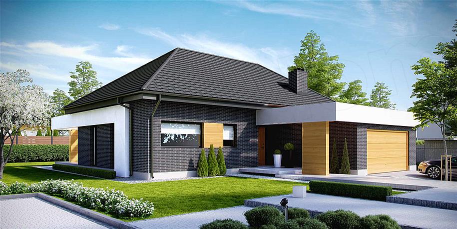 Tutaj mamy niemalże podobny schemat, dom jest podzielony na dwie strefy, również mamy garaż dla dwóch samochodów. Jest to jednak dom mniejszy od swojego poprzednika, co jednak nie znaczy, że nie jest wystarczający dla rodziny 2+2.